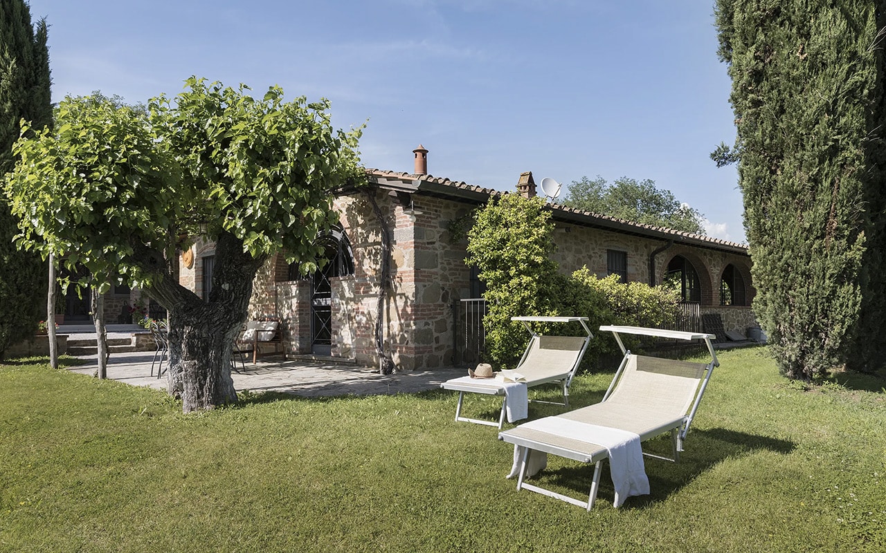The guests of the house can enjoy an outdoor private space with a wine-covered pergola with an amazing view of the farmhouse and a private garden.